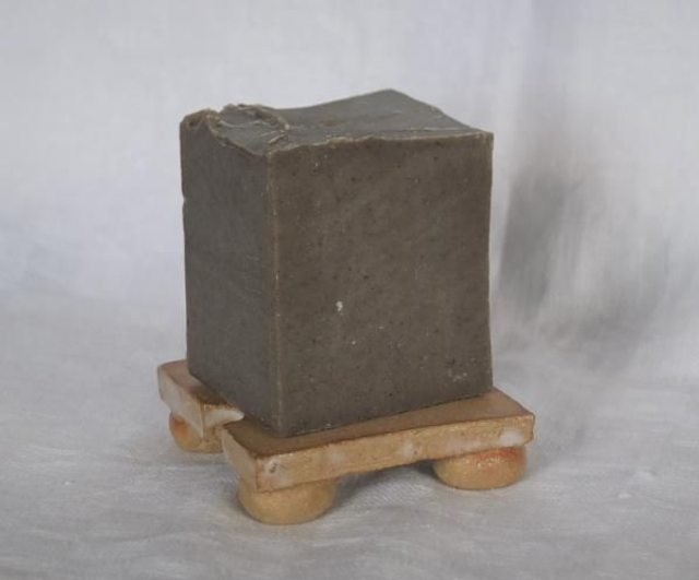A base de beurre de coco et d'huile de colza saponifiés à froid, le "savon" de ménage sans surgras contient de la cendre de cheminée tamisée et de l'huile essentielle de menthe poivrée.